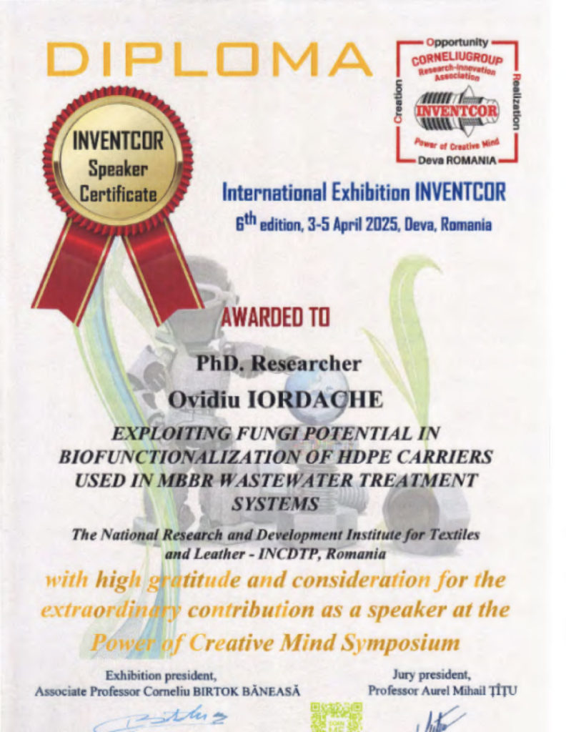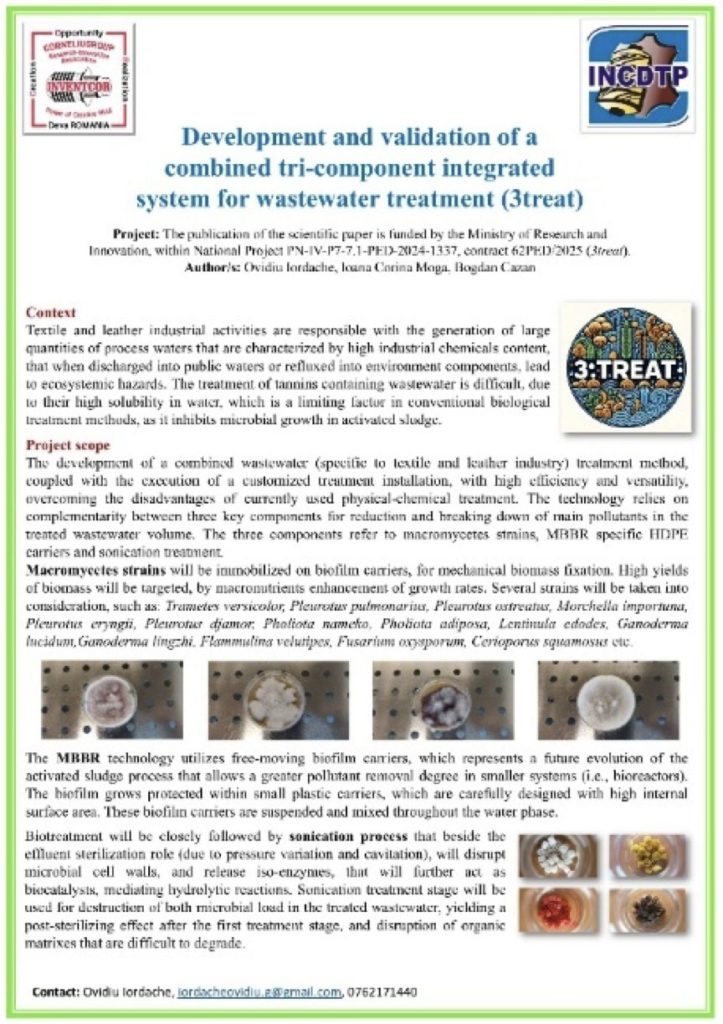 În etapa 1 a proiectului 3treat au fost puse bazele științifice și tehnologice ale unui sistem tri-component inovativ pentru tratarea apelor uzate provenite din industriile textile și de pielărie, caracterizate prin încărcări ridicate de coloranți sintetici, taninuri și alți poluanți greu biodegradabili. Soluția propusă integrează procese biologice și fizico-chimice – macromicete ligninolice, tehnologie MBBR (Moving Bed Biofilm Reactor) cu suporturi polimerice funcționalizate și sonicare – cu scopul de a depăși limitările schemelor convenționale de epurare. În această etapă au fost analizate comparativ tehnologiile actuale (MBBR, bioreactoare cu membrane, consorții bacterii–fungi, tratamente oxidative avansate) și au fost extrași parametrii de proces esențiali (pH, timp de retenție hidraulică – HRT, oxigenare, tip de biomasă) necesari proiectării unei instalații de laborator scalabile și ușor integrabile în fluxuri pilot de tratare.